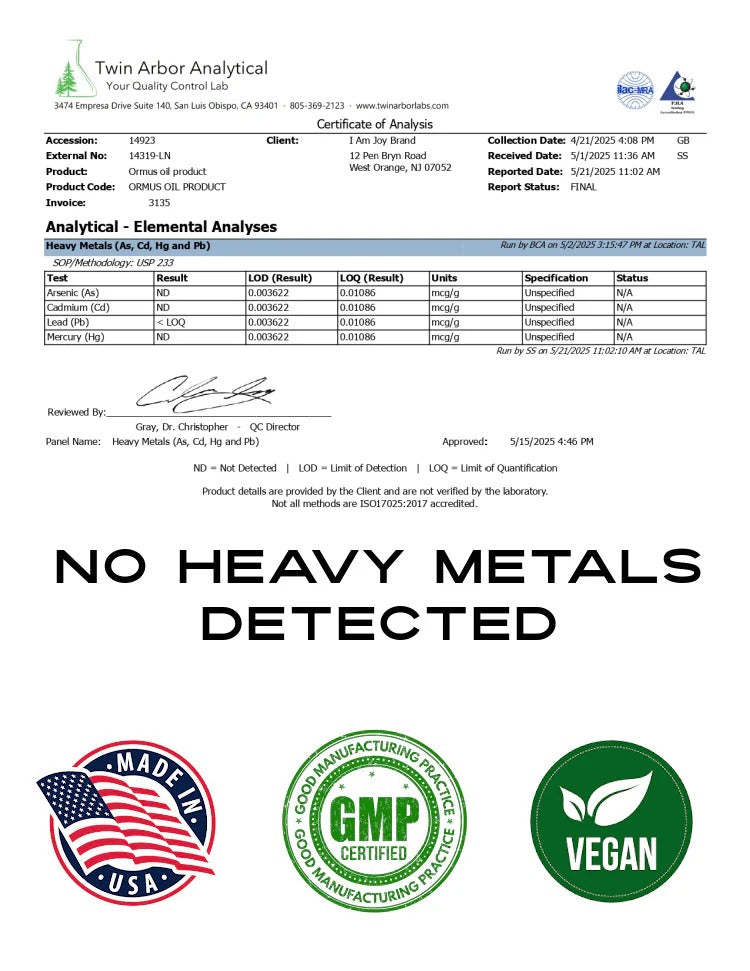 I Am Joy sets the standard fortransparencyin ORMUS supplements. Our products are lab tested by a3rd party lab in the USA.We're among the few companies that publicly share our Certificate of Analysis, showing our ORMUS isFREEfrom heavy metals.